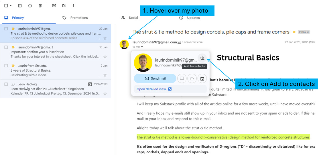 In Mail, open the email “The strut & tie method to design corbels, pile caps and frame corners” in the reading pane, and then select my name / my e-mail address.